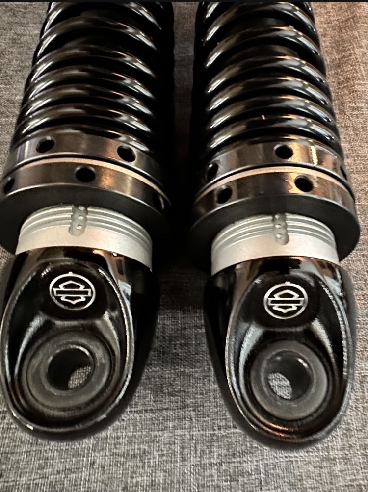 New OEM Harley Davidson Sportster Rear Shocks. Pulled off a New 2020 Sportster • Enhanced compression and rebound damping control when compared to typical twin-tube shock absorbers • Nitrogen gas charged shocks resist oil aeration and work with the internal valve stack to provide superior damping control in the twisties • Large pistons and low viscosity high-performance oil allow these shocks to react quickly to impacts and keep the tires tracking the road surface • Locking threaded adjustment lets you fine tune the spring preload to your current riding conditions – whether a solo run on the back roads or a fully-loaded two-up freeway tour • With the addition of urethane bumpers, you get a controlled ride and minimized bottoming harshness • Includes left and right shock and preload adjustment Price to sell $200 Retail is $635 plus tax