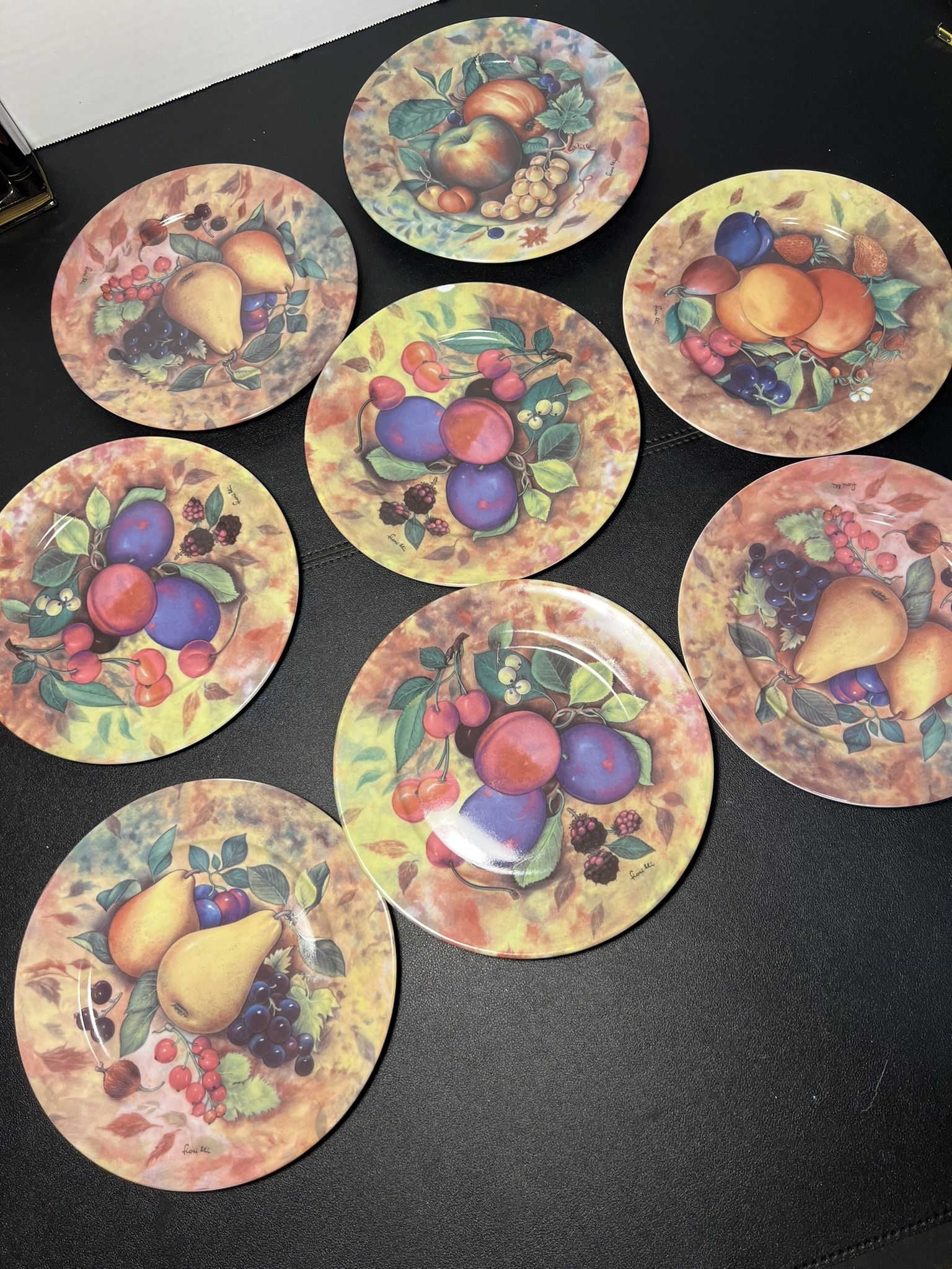 Email De Limoges Godinger Vintage 1970 To 1990 8 Still Life Salad Plates Signed 8 “Still Life” pattern salad plates in pristine vintage condition - no signs of use Different fruits in vibrant colors Email De Limoge means Enamel Limoges: the design is applied using enamel, a glass-like substance that is fused to the porcelain surface through a firing process All plates are signed by the artist Fiori Eli (picture) Pictures are part of the description, please check them & let me know if you require additional ones Defects & imperfections - please check pictures made under the bright light & magnification: one of the plates has a small rim chip acquired during the move. It was touched up with paint Diameter 7.5 in Weight 4 lb 13 oz Matching mugs & dinner plates are posted in separate listings