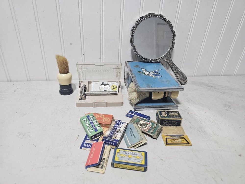 Lot of vintage shaving items. Old razor and razor blades. Mirror. Shaving kit. All for $35