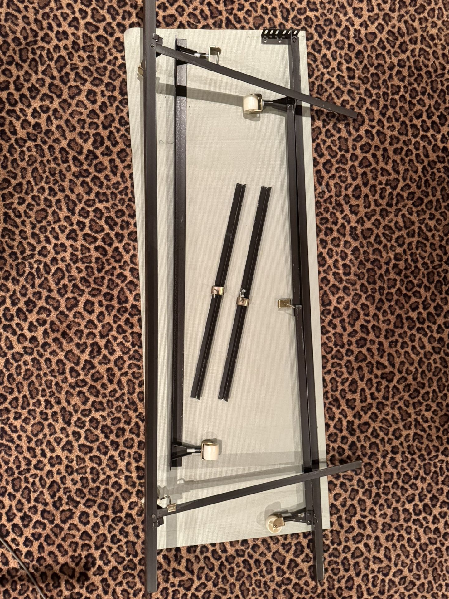 King size bed frame w center bar support. Please not the center bar is missing a wheel. But a small 2x 4 piece of wood worked! Smoke free house # 104