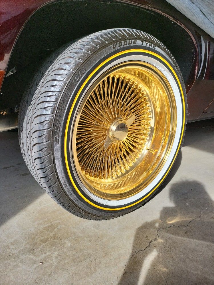 18" all gold Player wire wheel with 90% true Vogue tires mounted. full set with the rear rims are reverse and fronts are standard giving the look of staggered look asking $7,300.00 comes with the 5 lug universal adapter and two prong spinner
