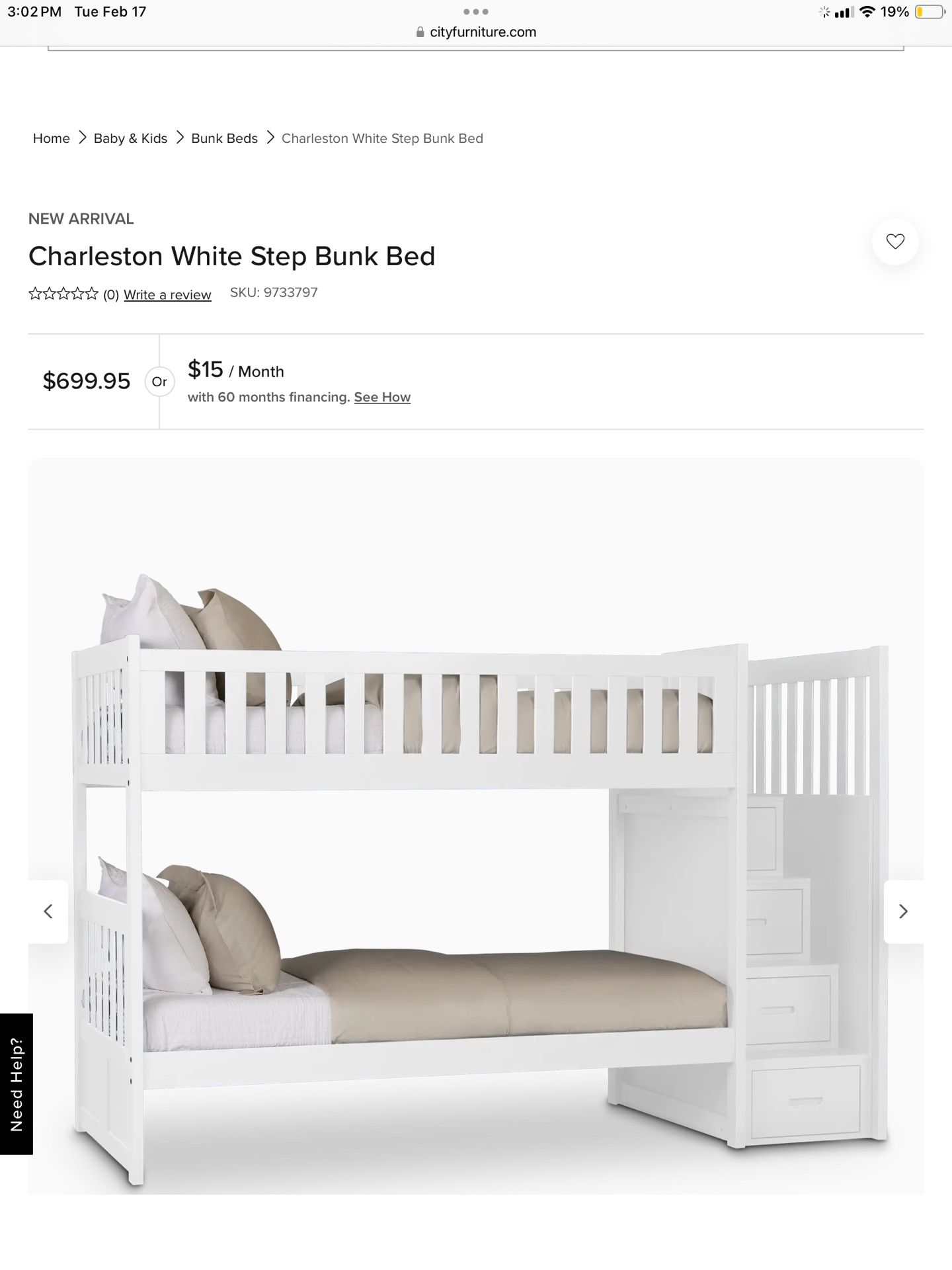 Form rooms to go or city furniture don’t remember which, see bed for sale now for $800 in picture. Beautiful wood bunk bed, safer than a bed with a ladder, stairs have storage drawers , so even more storage in the kids bedroom now! Priced to sell please just come and get it!
