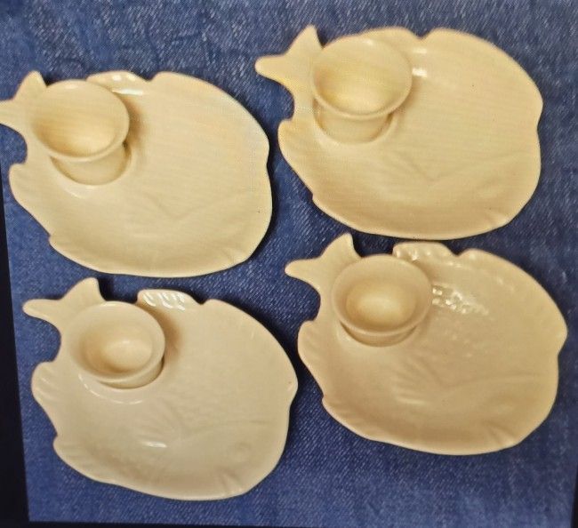 Vintage 8 Piece WHITE California Pottery Fish Shaped Plates with Dipping Cups