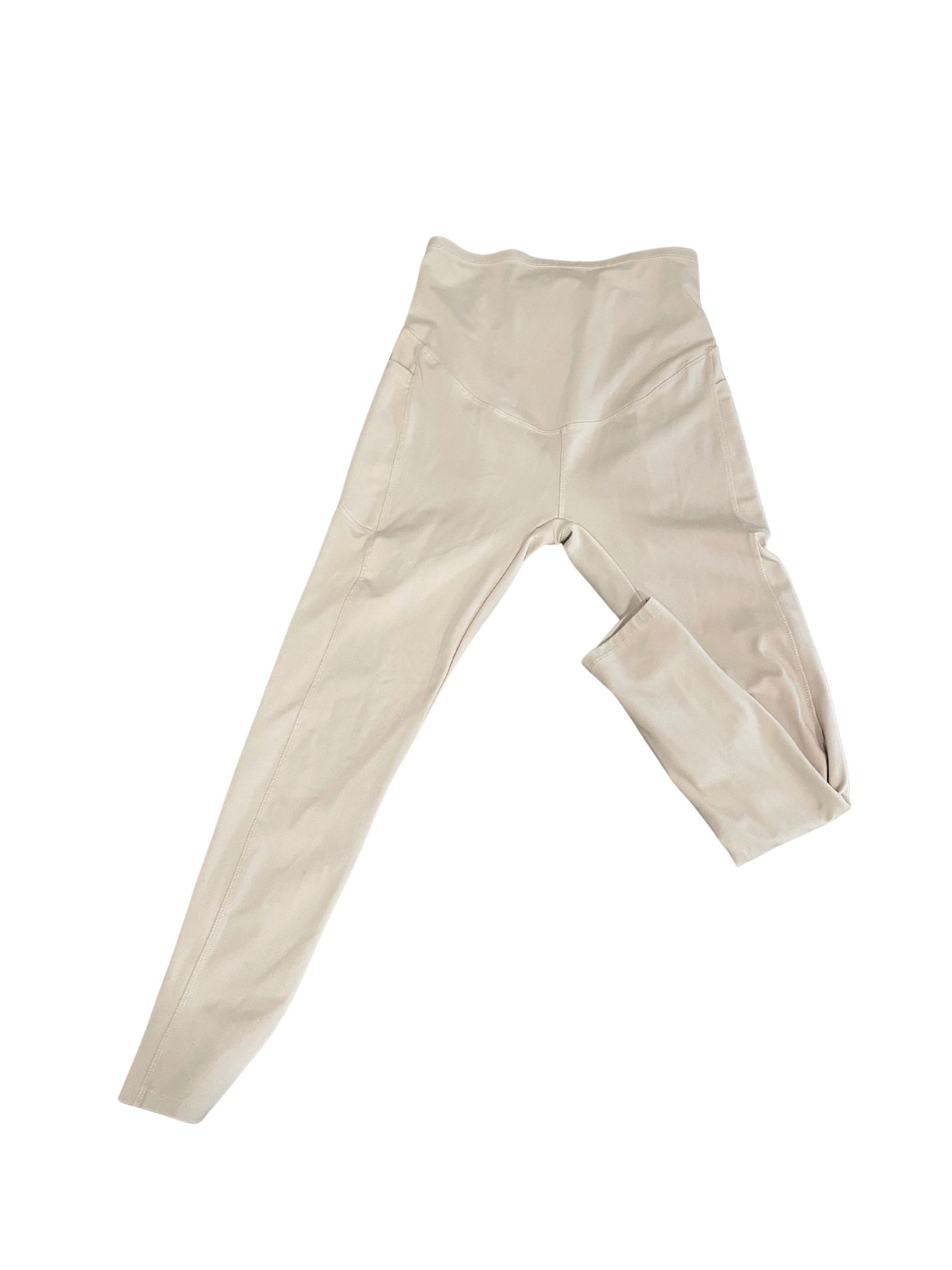 Stylish high-waisted maternity leggings with side pockets in a soft cream color. Perfect for workouts or casual wear.