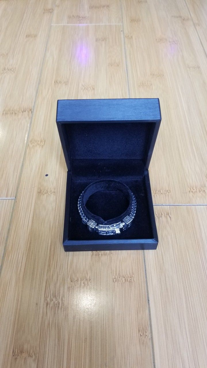Bracelet was too small. Worn only to showcase in picture and when I originally tried it on after purchase. It has been in the box since I purchased it. I am an ambassador for Undaunted Jewelry. Stainless Steel 316L. Size 20. My wrist is 7 inches in circumference and it almost fits. I paid 60 for it.