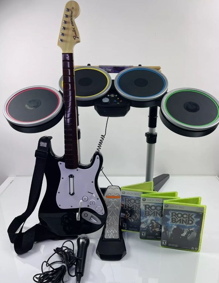 Xbox 360 Rock Band 2 3 Drum Set Guitar Fender Bundle Mic 3 Games