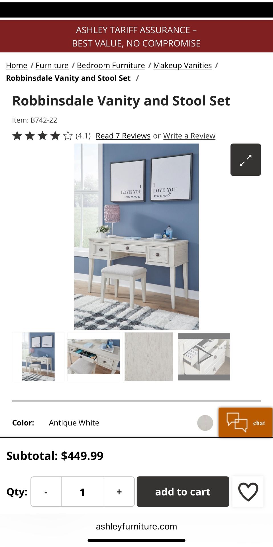 This is a new in the box vanity and stool set from Ashley’s furniture. Exactly what is pictured is in the box same color as well. Retail is $450 but purchase with me and save $200!!