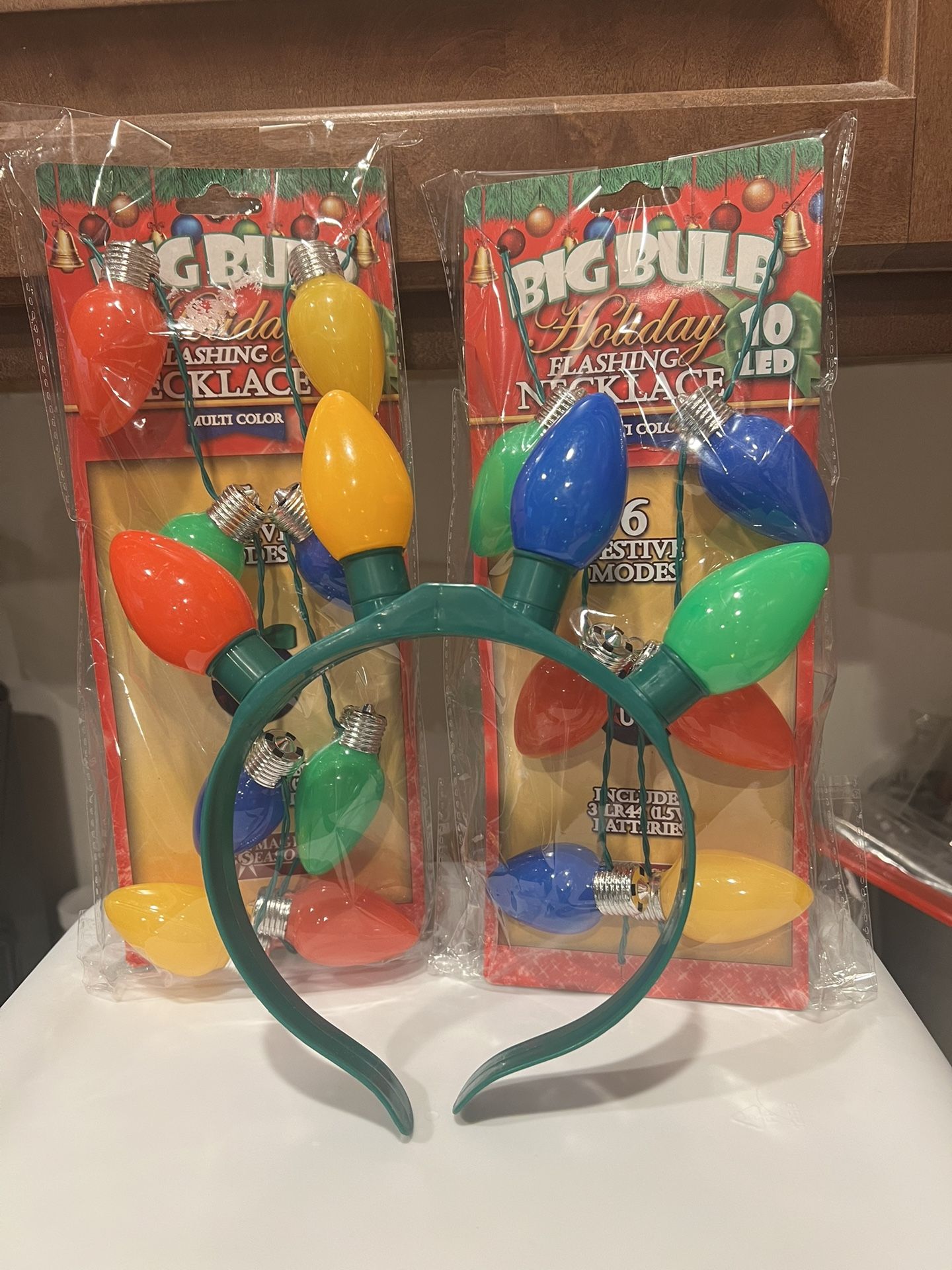 Brand New Set Of 3 Big Bulb Christmas Holiday Light Up Necklaces & Headband