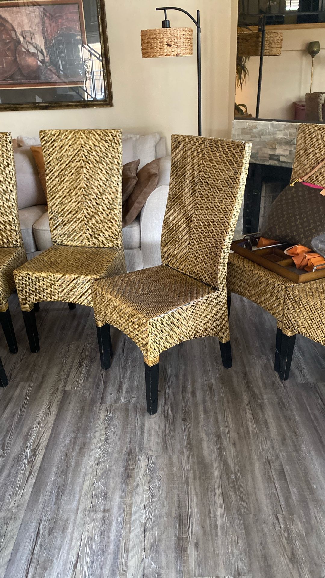 6 well make woven chairs 33” height 17” total depth, great shape and sturdy . Needed a change