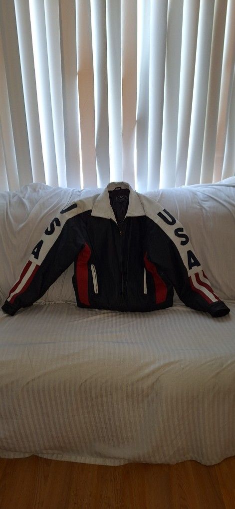 Vintage USA patriotic leather jacket by Oasis in excellent condition. This jacket is barely used and it's been storage and is ready to go. Just $80. You pick up. Chaqueta de cuero patriótica vintage de la marca Oasis en excelentes condiciones. Esta chaqueta apenas ha sido usadapocas veces, ha estado guardada y está lista para usarse. Sólo $80. Usted recoge.