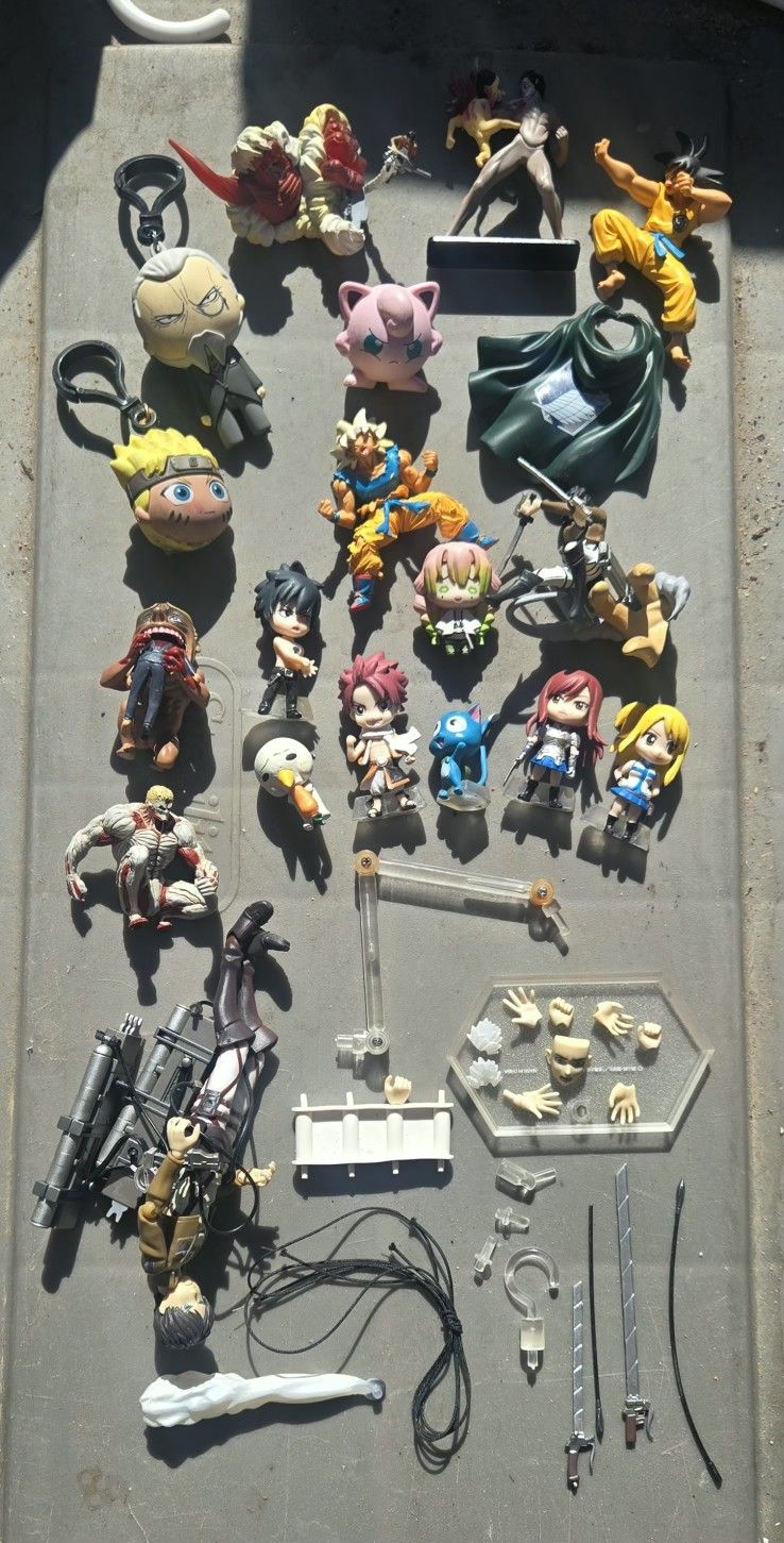 some new, some used all out of package all pieces represented in pics are what I have all goes to the buyer $250 OBO *stickers are free w/ purchase This image contains a diverse assortment of anime and pop culture collectibles, ranging from articulated action figures to small gashapon (capsule toy) figurines and bag clips. The collection features characters from popular series such as Attack on Titan, Fairy Tail, Dragon Ball Z, and Spy x Family. Collection Highlights Attack on Titan Characters Eren Yeager (Titan Form): A large sculpture of Eren in his titan form, characterized by his muscular build and reaching pose. Armored Titan: A detailed figurine of the Armored Titan in a crouching, powerful stance. Eren Yeager (Human Form): An articulated action figure of Eren in his Scout Regiment uniform, equipped with Omni-directional mobility gear. Accessories: The collection includes various accessories for these figures, such as a large green Scout Regiment cape. Fairy Tail Miniatures A set of small, "deformed" or chibi-style figures from the Fairy Tail series is present: Natsu Dragneel: Chibi figurines of the main protagonist, some designed as keychain swing mascots. Lucy Heartfilia: Mini figures and bag clips of Lucy, including a rare Funko Mystery Mini. Erza Scarlet: Small figures of Erza in her signature armor. Dragon Ball Z & Others Son Goku: Several figures of Goku are visible, including one in a mid-air kicking pose and another in a Super Saiyan battle stance. Jigglypuff: A small pink figure of the Pokémon Jigglypuff. Henry Henderson: A figural bag clip of the elegant instructor from Spy x Family. Naruto Uzumaki: A 3D figural bag clip keychain of Naruto. Collectible Details and Pricing Many of these items are frequently found in "mystery bag" or "gashapon" series, often sold as loose lots in secondary markets. Item Estimated Price Brand/Series Armored Titan Figure USD $35.00 - $60.00 Kaiyodo Real Figure Collection Eren Yeager Action Figure USD $7.00 - $15.00 Total Anime / Hasbro Lucy Heartfilia (Rare Mini) ~USD $55.00 Funko Mystery Minis Series 1 Natsu Dragneel Keychain USD $13.59 - $49.00 Takara Tomy Arts Henry Henderson Bag Clip USD $5.45 - $12.87 Monogram Series