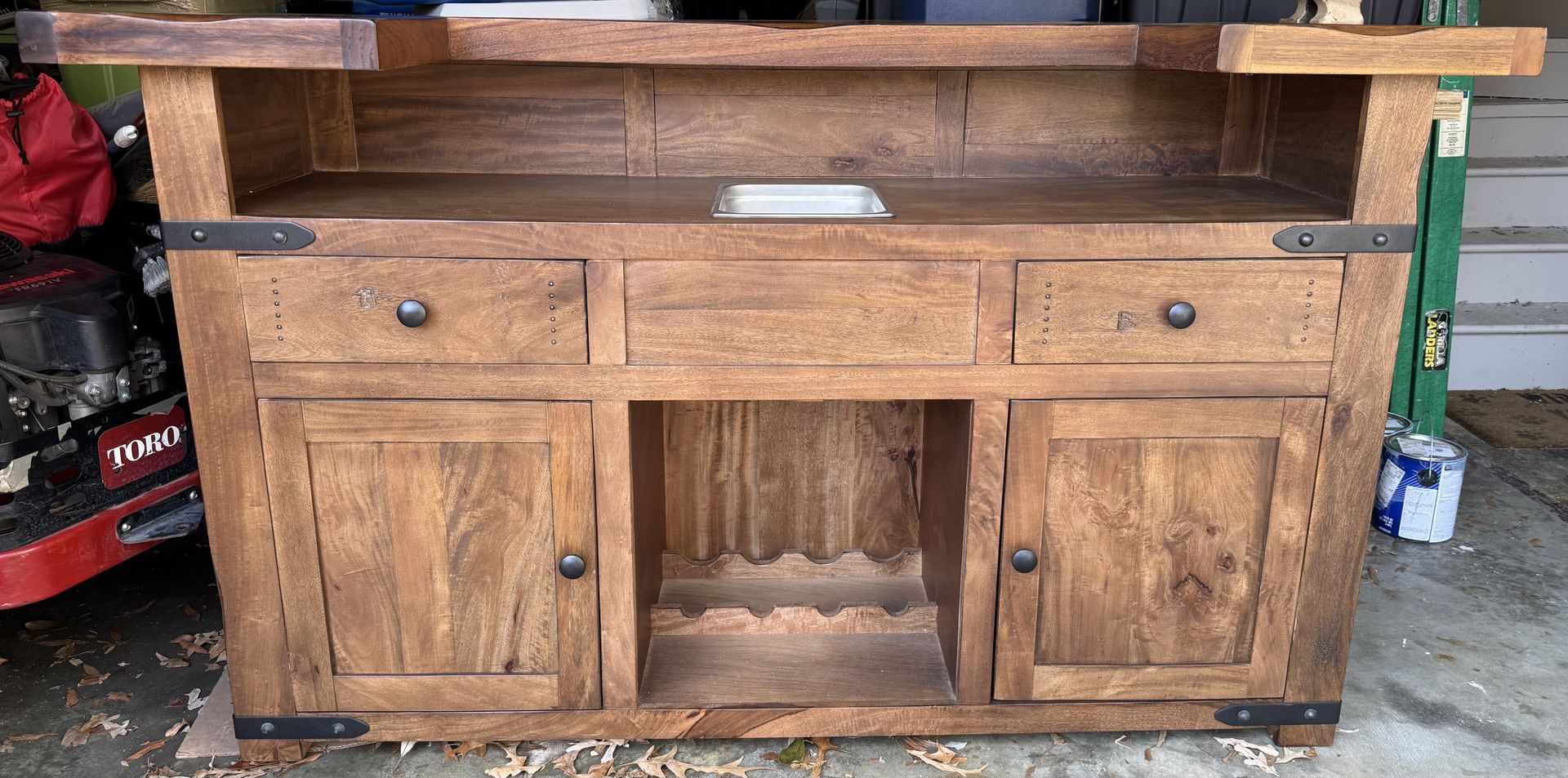 Beautiful wood bar with great detailing and black iron accents and foot rest. Room for three barstools across the front and one on each side. The “serving” side of the bar features two drawers, two covered spaces and a wine rack. The covered spaces are big enough to fit a mini fridge or wine cooler. Bar is approximately 44” tall, 74.5” long and 28.5” deep.