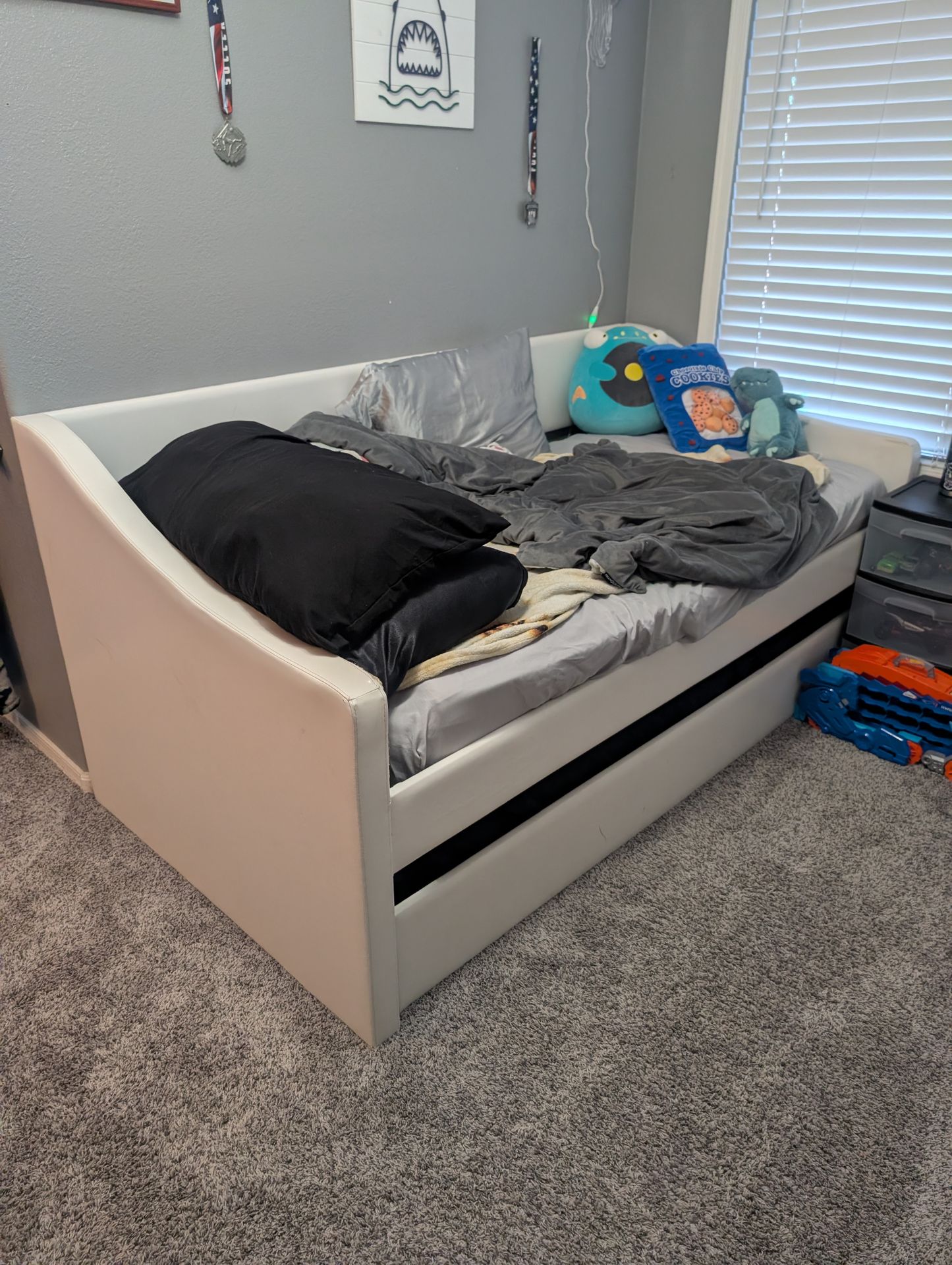 Pretty good condition, normal wear and tear. There is a tear in one of the sides, it is pictured. Smoke free home. Will come with both twin mattresses, mattress protectors and fitted sheets.
