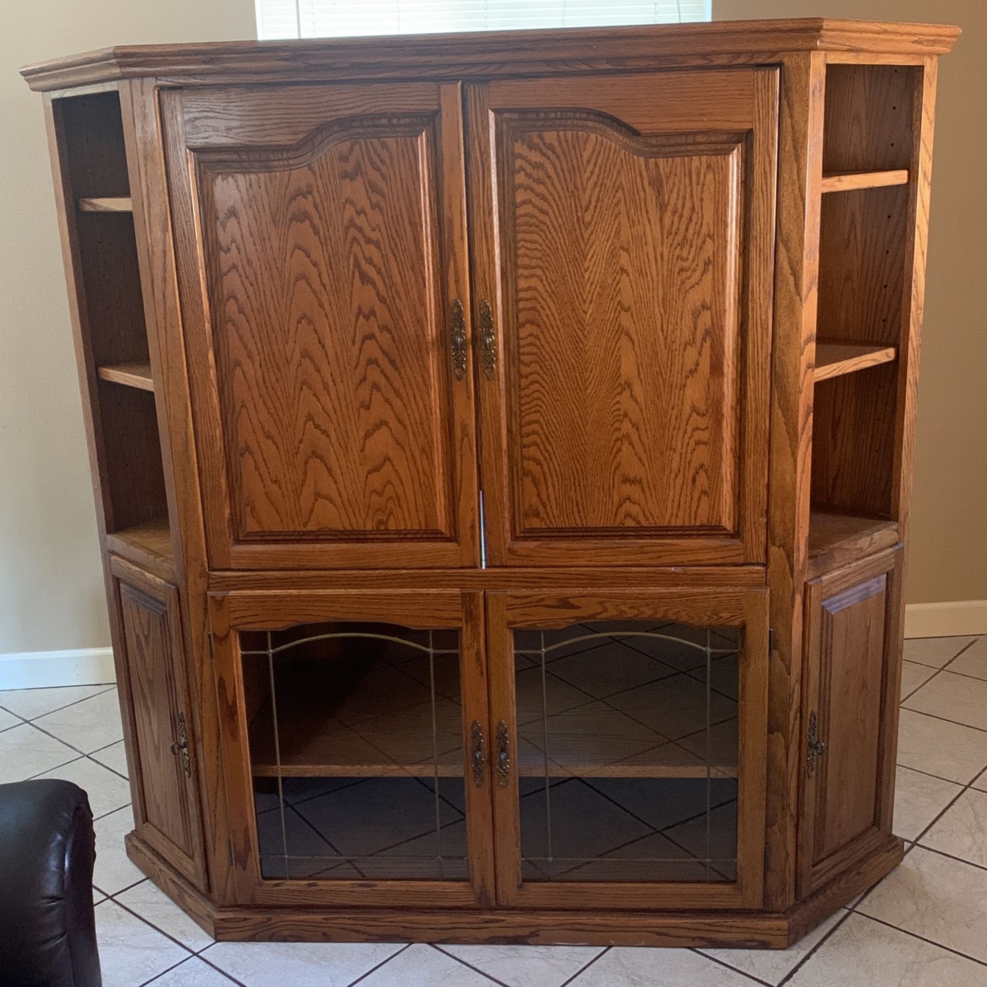 Tv media console with side compartments and bottom glass doors. Very nice sturdy built. 28 in width, 67 in length and 66 in height. The inside compartment would only fit a 40 in tv.