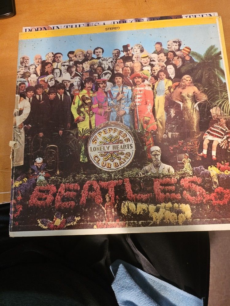 Selling a vinyl record of The Beatles' "Sgt. Pepper's Lonely Hearts Club Band" album. A classic album for any Beatles fan!