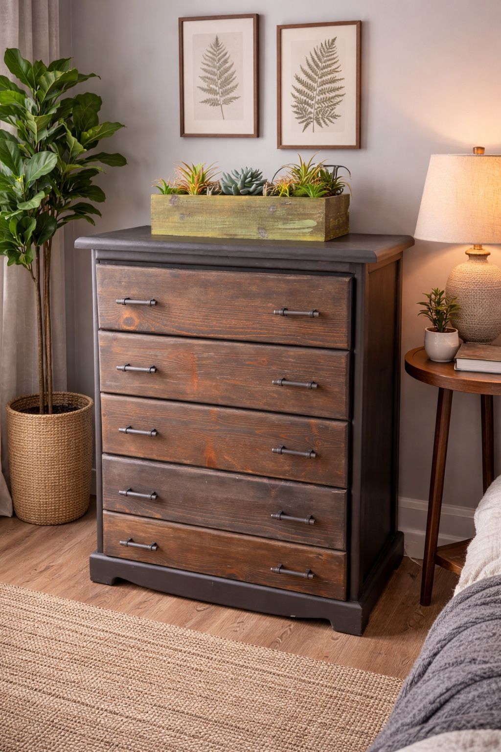 Selling my dresser as I have change room decor; it’s espresso wood with industrial handles.