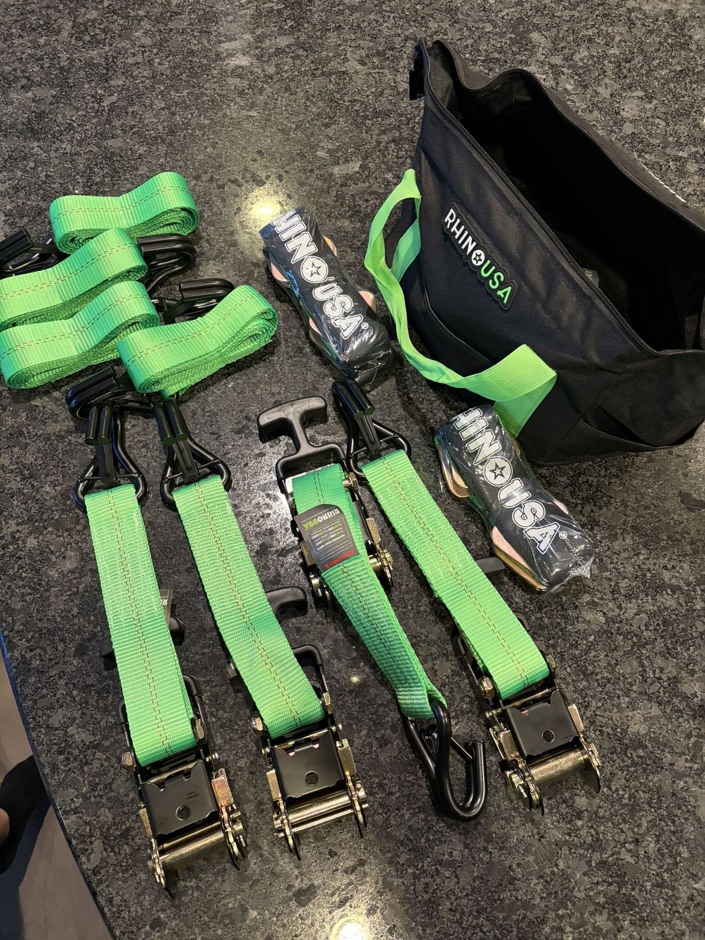 Never used. Universal 2" x 8' Vehicle Tie-Down Kit (2IN-HDKIT-GRN) by Rhino USA®. J-Hooks. Color: Green. Introducing the Rhino USA Heavy Duty Vehicle Ratchet Tie Down Kit. This kit is your ultimate solution for securing and transporting heavy loads with ease and confidence, whether you're hauling vehicles, motorcycles, or other valuable cargo.