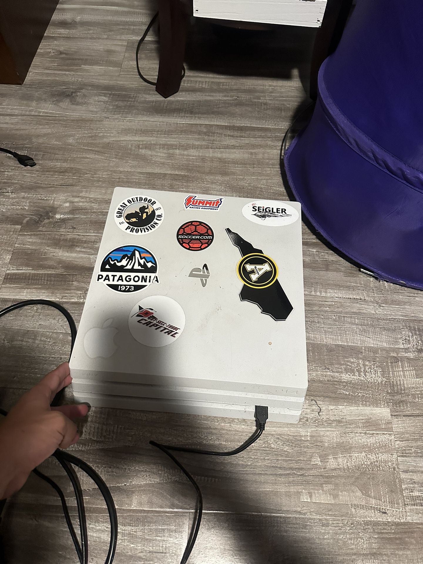 PS4 pro white color way 1TB. Works great brings all cords and a controller charger but no controller I lost it. Has stickers but they could be taken off. Feel free to offer $80
