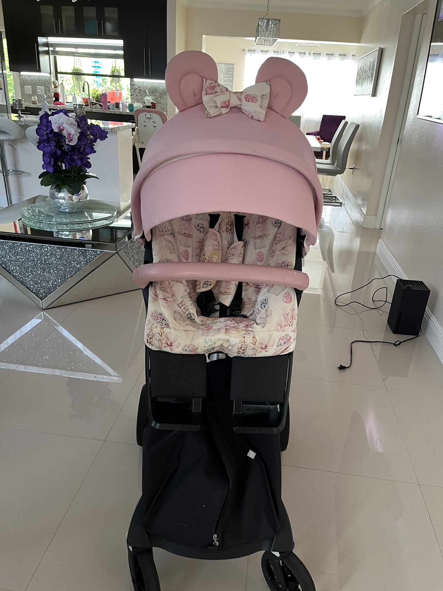 Stokke stroller xplory v6 Beautiful stokke v6 stroller with custom made pink cover with ears and bow. Black original stokke cover available as well. Detacheable sibling board included. Sold with cup holder