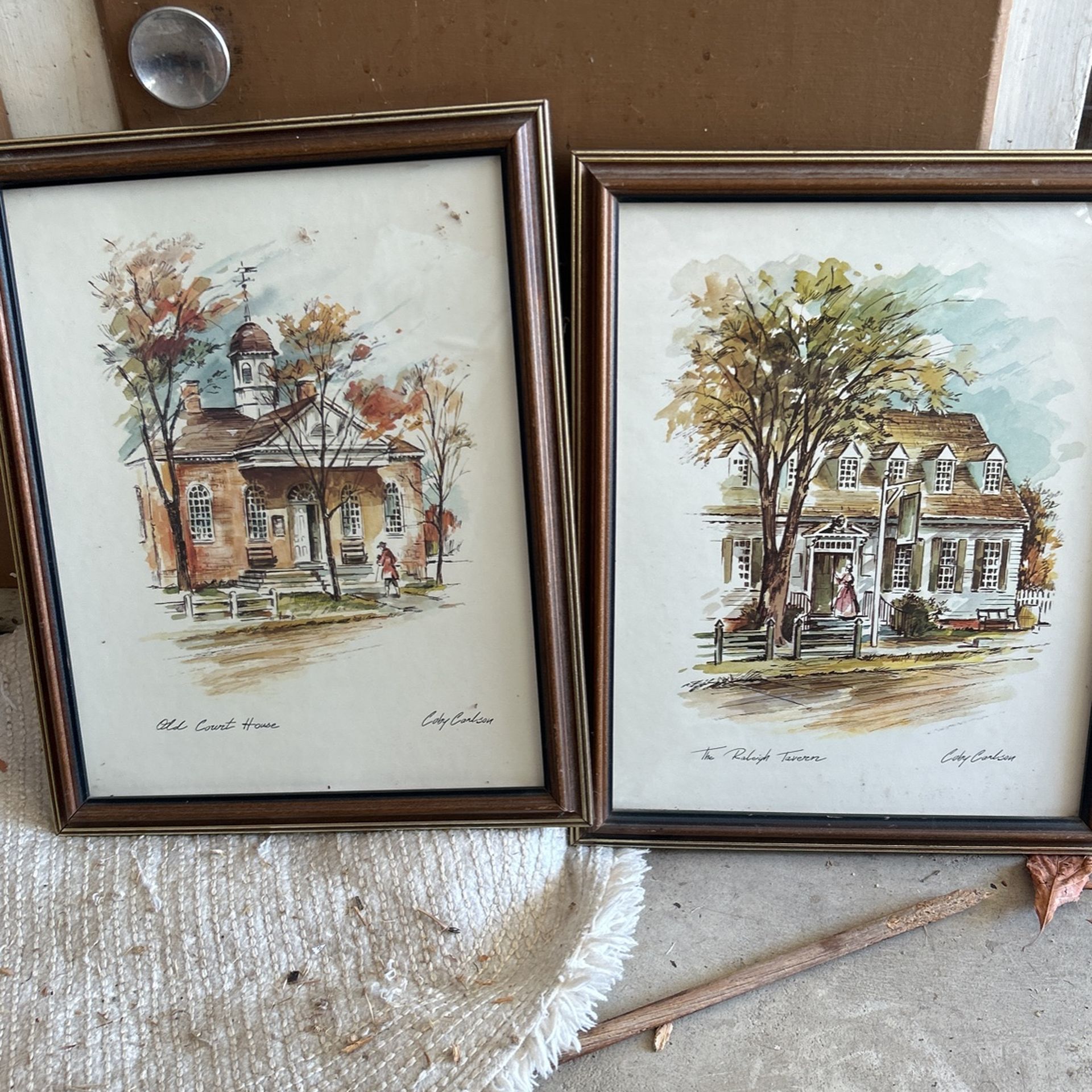 Vintage framed print signed by Coby Carlson. The Raleigh Tavern and Old court House. In frame measures approximately 16 by 13