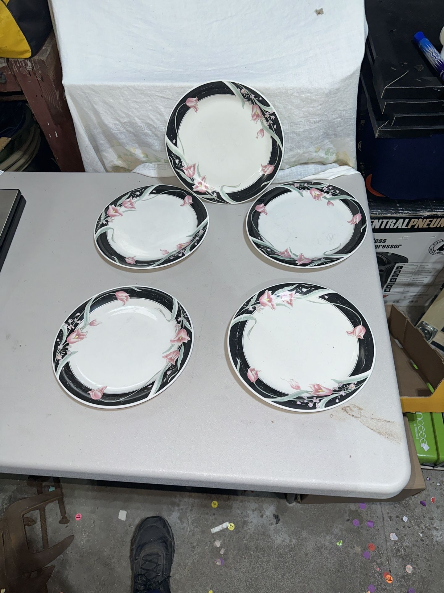 Five dinner plates. Designs on plates have scratches (see pictures). Also have fifteen more plates if want to buy more than five. Can be shipped