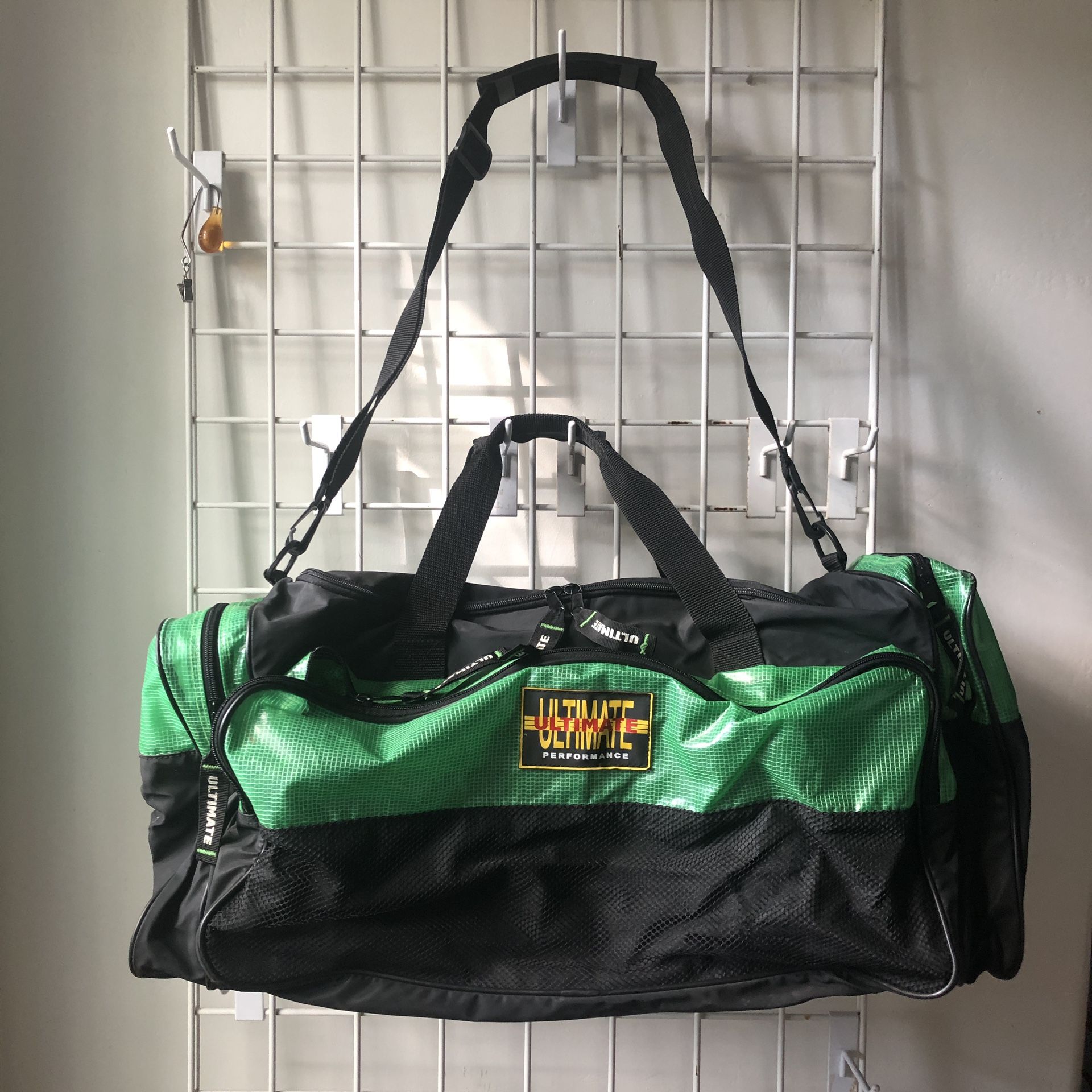 Retro large gym bag from ULTIMATE PERFORMANCE features double zippered top open / Long zippered front compartment w breathable green plastic / 2 zippered top side compartments w breathable green plastic / Approx: 20" (L) x 10" (W) x 12" (H) / Woven removable shoulder strap w cushion shoulder pad for extra comfort + 2 woven grab handles / Logo zipper tabs / Black vinyl piping all around / Clean oder free interior.