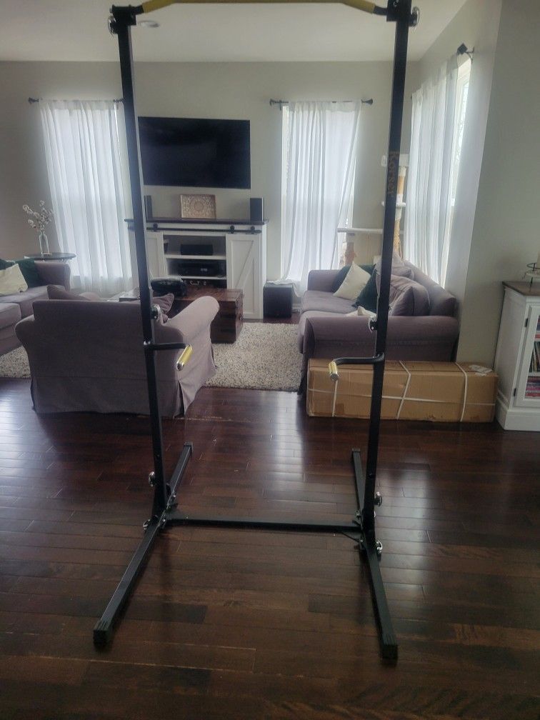 Portable pull-up bar that can be set up in under 2 minutes and broken down just as quickly and stored out of the way! Perfect to get in some quick reps. Dip handles can be removed and moved to a lower position to work on elevated push-ups, too. It's a great all-around bar for those with limited space. The top of the bar is about 82 inches. I ended up getting something else that's a little more permanent, so I no longer need this. Pickup only.