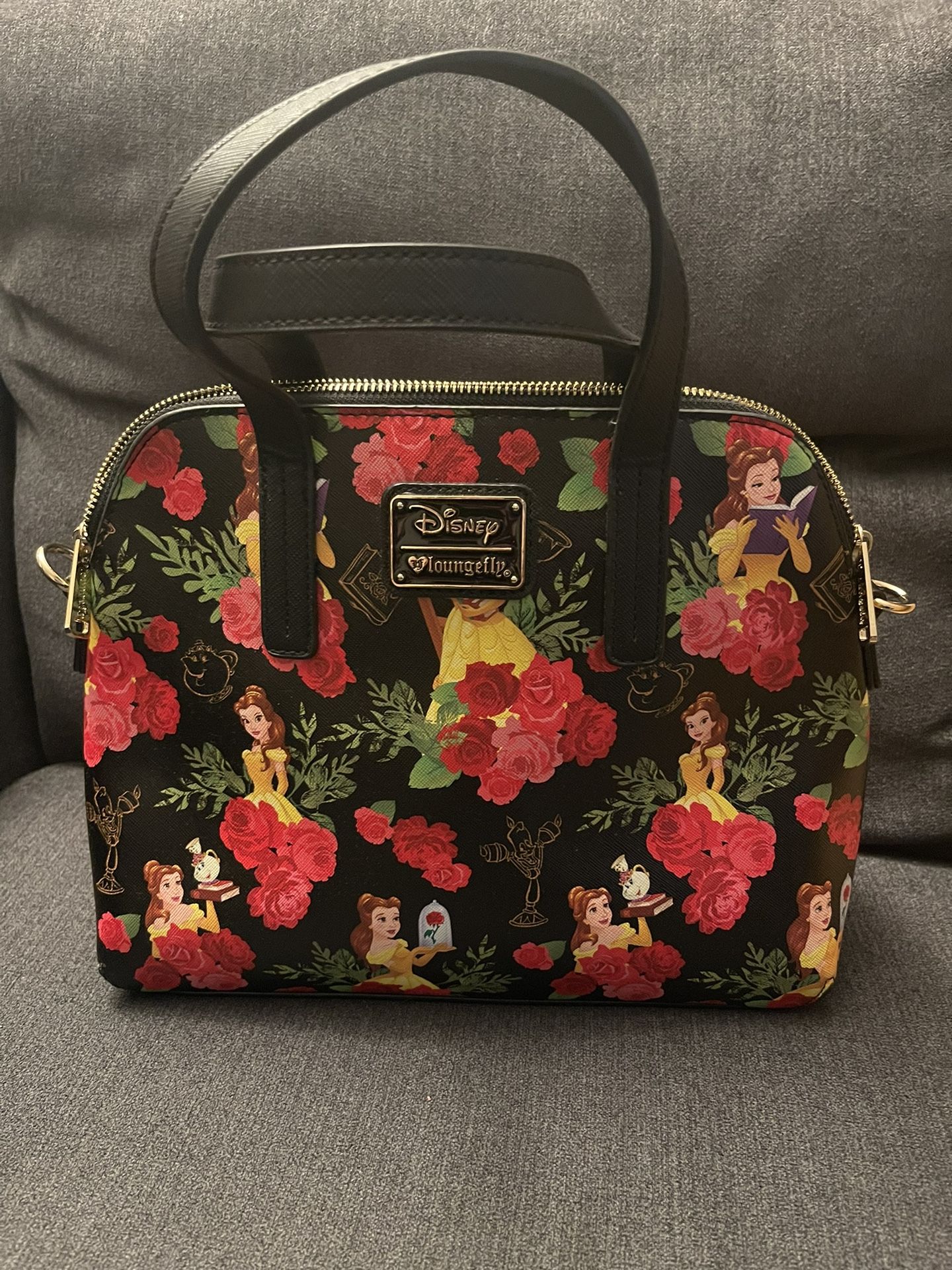 Loungefly x Disney Faux Leather Handbag with Printed Details. Includes Removable Shoulder Strap. Belle floral print Pebble faux leather Adjustable and removable shoulder strap Carry handles Interior zip pocket Interior slip pocket Gold-tone hardware Fully lined 11 1/2'' W x 9'' H x 5'' D Imported