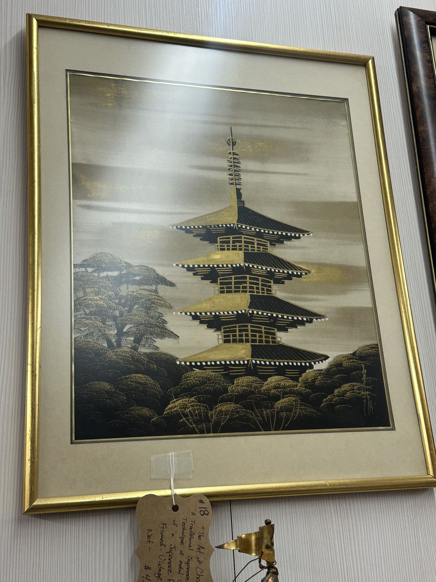 The Art of Chokin - A Traditional Japanese Technique of Metal Carving of a Japanese Pagoda framed in a gold frame. Located in - Main Street Antiques 208 E. Main Street Turlock, Ca. 95380 Located in booth #18. Ask for 18, there are two locations for 18 in this store. Price is $45.00 plus tax.