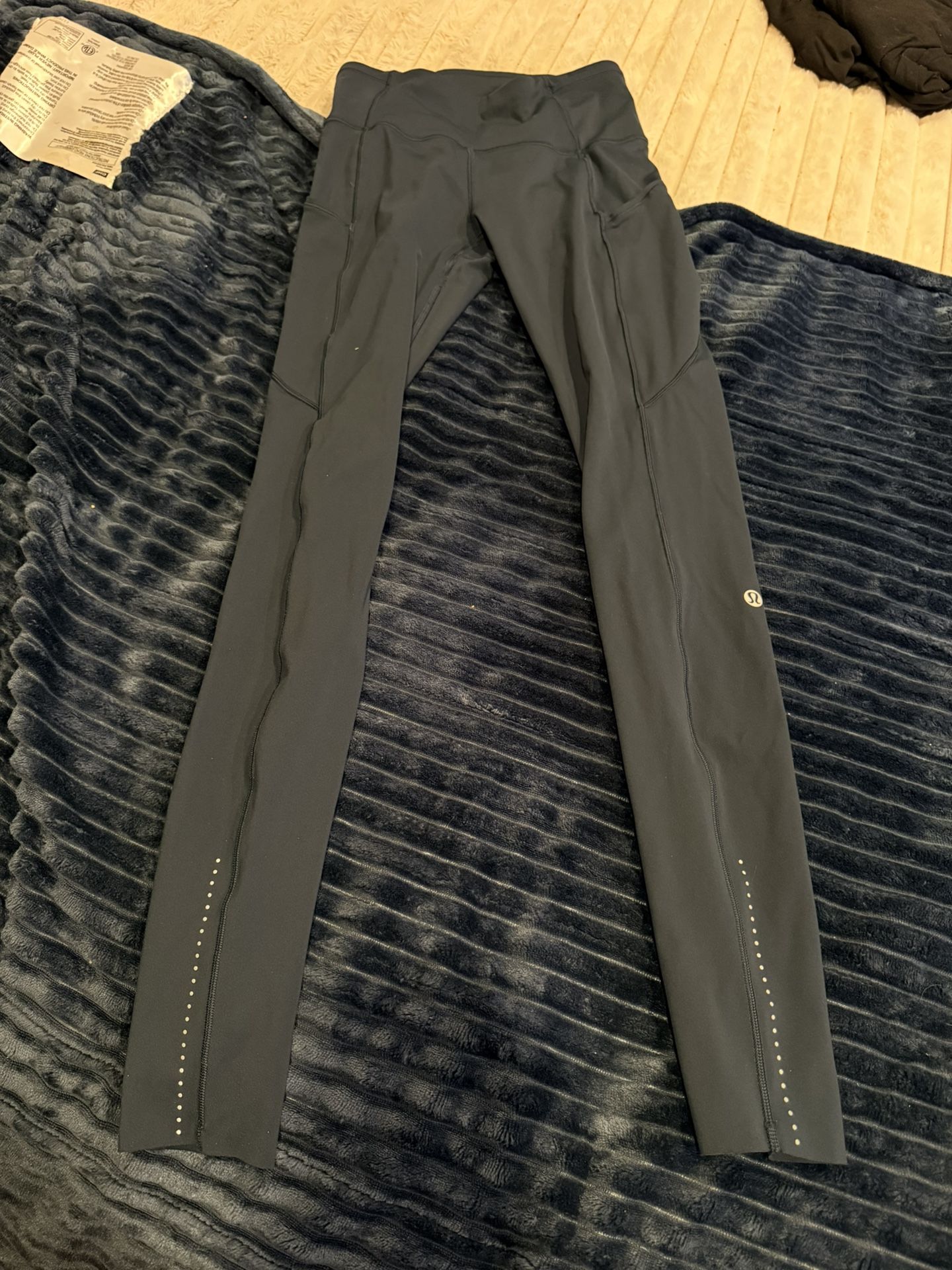 Dark navy running pants. Slit pockets in waist, side pockets, adjustable tie waist, moisture wicking fabric. Great condition.