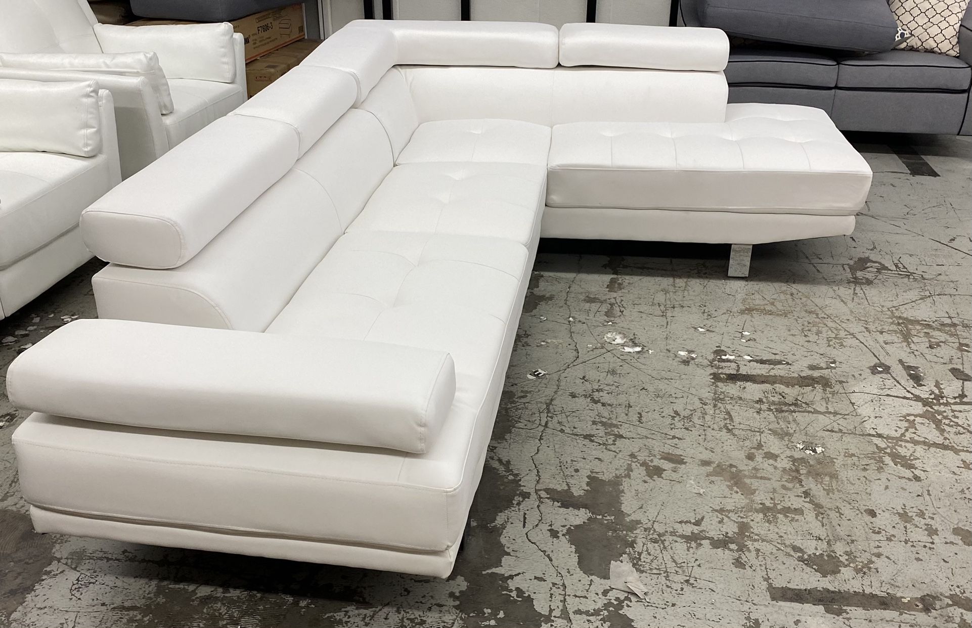 Brand New Modern White Leather 2 Piece Sectional 105 x 77 x 33H Only $50 Down! Easy Financing Available with Zero Interest for 90 Days! No Credit Needed! Can text you an application now for approval within minutes! Free Delivery and Setup.
