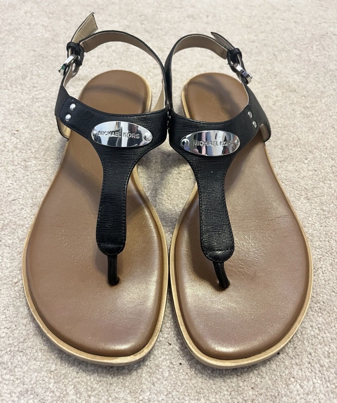 Slingback strap with adjustable buckle closure. Man-made insole. Lightly padded footbed. Rubber outsole. Minimal wear to heel/sole.