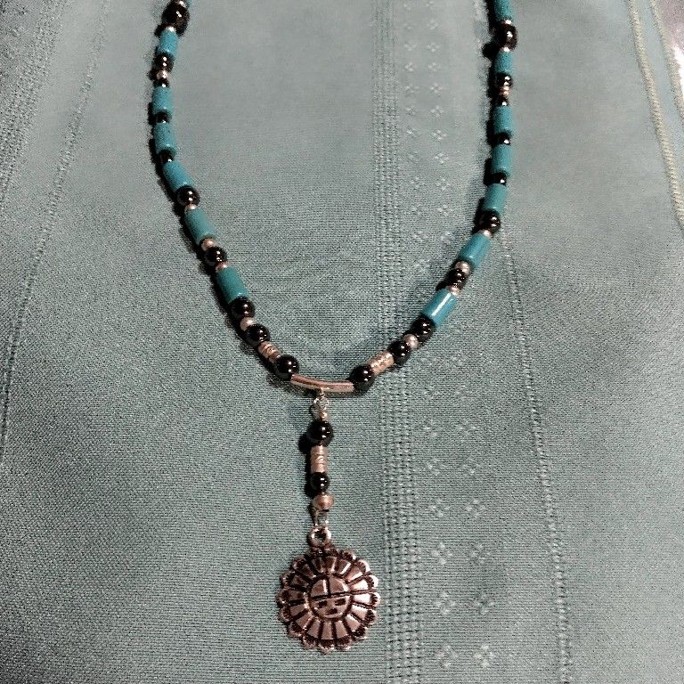 (N-55926) HANDMADE TURQUOISE AND HEMATITE NECKLACE. MATERIALS: MOJAVE TURQUOISE CHUNKS, AND CYLINDERS OF SLEEPING BEAUTY, TURQUOISE. ALONG WITH GENUINE MULTI-CUTS OF BLACK SHIMMERY HEMATITE. STERLING SILVER BEADING, HUGE, STERLING LOBSTER CLAW CLASP., FOR THE EASIEST APPLICATION , ON AND OFF. STERLING DROP OF A ZUNI SUN GOD. 26" EXTRA LONG INCHES OF A GORGEOUS AND VERSATILE NECKLACE IF DESIRED YOU COULD EASILY WRAP IT AROUND YOUR NECK TWICE. FOR AN AWESOME AND UNIQUE PERSONAL LOOK. A BEAUTIFUL PIECE FOR YOUR JEWELRY COLLECTION.