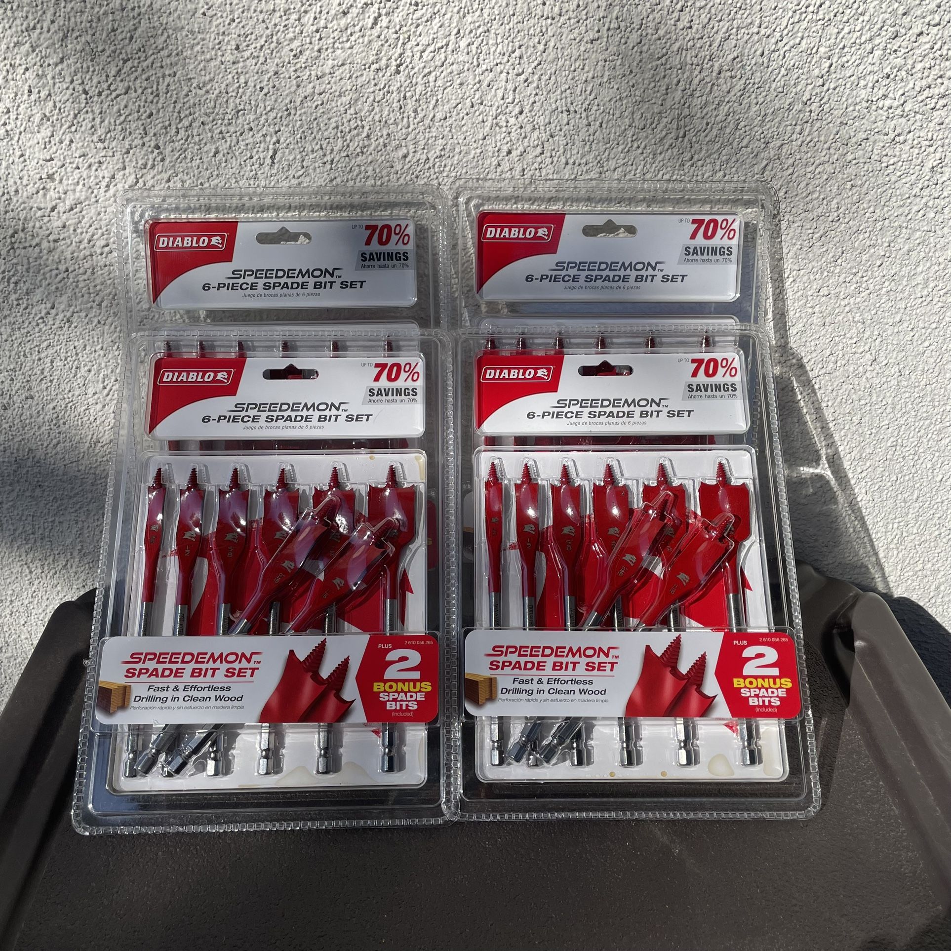 DIABLO (8-Piece) 6-Piece SPEEDemon High Speed Steel Spade Bit Set with 2-Bonus Bits $28 for 4 $15 for 2 $10 for 1 Brand New. Unopened Box. DIABLO SPEEDemon Spade Bit range provides 1 of the fastest, most effortless hole drilling solutions on the market for fast, clean wood. The high-performance SPEED-TIP design self-feeds, drilling faster holes in overhead applications. An optimized Curved Paddle design enhances the chip evacuation process for more holes per charge. This range is Impact Strong for increased shank stability and durability in cordless and corded impact and drill drivers. This set of 6 in bits includes the following sizes - 3/8 in, 1/2 in, 9/16 in, 5/8 in, 11/16 in, 3/4 in, 7/8 in & 1 in. * 6-piece set with 2 bonus bits offers up to 70% in savings * Speed-tip self-feed design effortlessly pulls the bit with minimal effort and faster holes in overhead drilling applications * Optimized curved paddle design quickly removes chip build-up for more holes per charge * Impact strong increases shank stability and durability * Angled spur cutting edge scores wood for clean holes and reduced blowout * Maximum performance in cordless and corded impact and drill drivers * Set contains: 3/8 in., 5/8 in., 3/4 in., 7/8 in., 1 in. and bonus 9/16 in., 11/16 in. bits