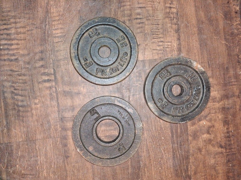 STEEL WEIGHT LIFTING PLATES, 2 ARE 5LBS AND 1 IS 2.5LB