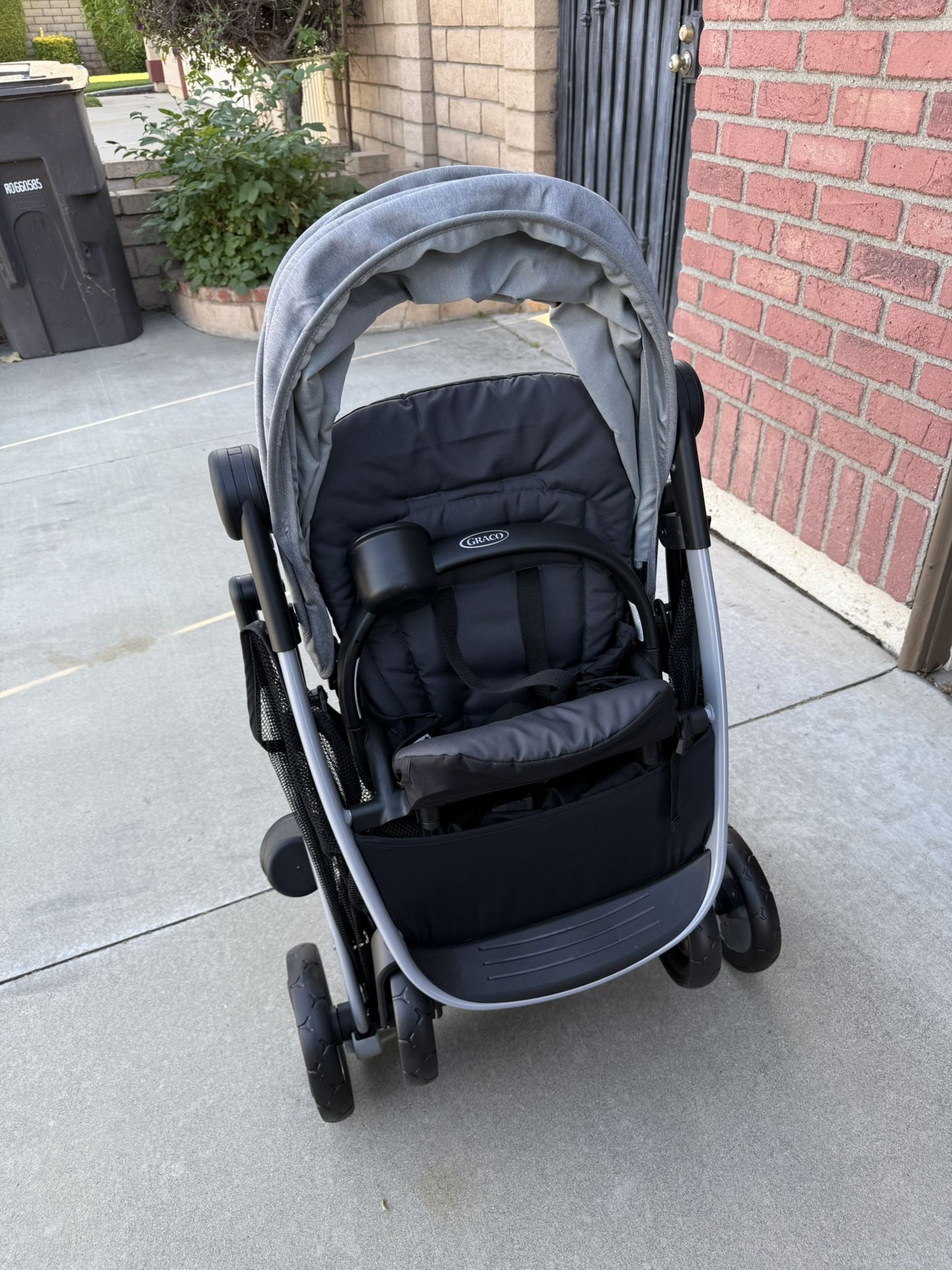 This Graco double stroller features a bench seat and standing platform, making it perfect for accommodating multiple children as your family grows. It was never used and also can provide a baby car seat as well.
