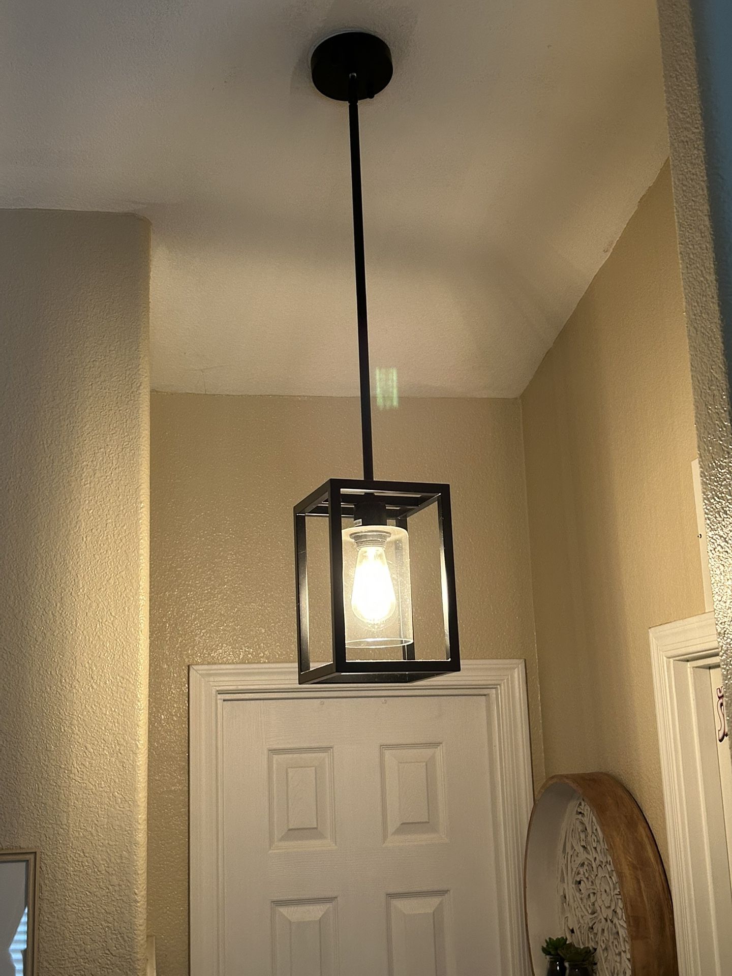 Dimmable, adjustable length, like new, bought only a few months ago (for $61 for the fixture plus the bulb). Bulb included. Fixture Height 10 in Maximum Hanging Length 47.5 in Mounting Plate Height 1 in Mounting Plate Width 5 in Product Depth 7 in Product Width 7 in