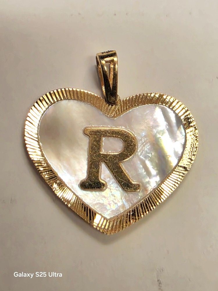 The Mother Of Pearl Heart 18k R Initial Pendant by Saudi Gold is a luxurious piece of fine jewelry featuring a stunning mother of pearl or abalone main stone set in 18k yellow gold. The pendant's elegant design and high-quality craftsmanship make it a beautiful and unique accessory perfect for adding a touch of sophistication to any outfit. 18mm in size.