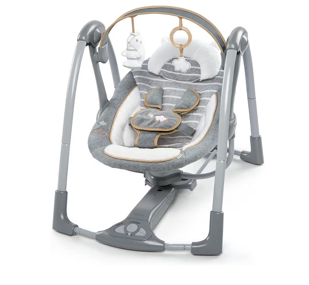 New Ingenuity Swing 'n Go Deluxe 5-Speed Baby Swing with Cushioned Harness - Foldable, Portable, 2 Plush Toys & Sounds, 0-9 Months 6-20 lbs (Bella Teddy). Runs on batteries only ($100 retail price).