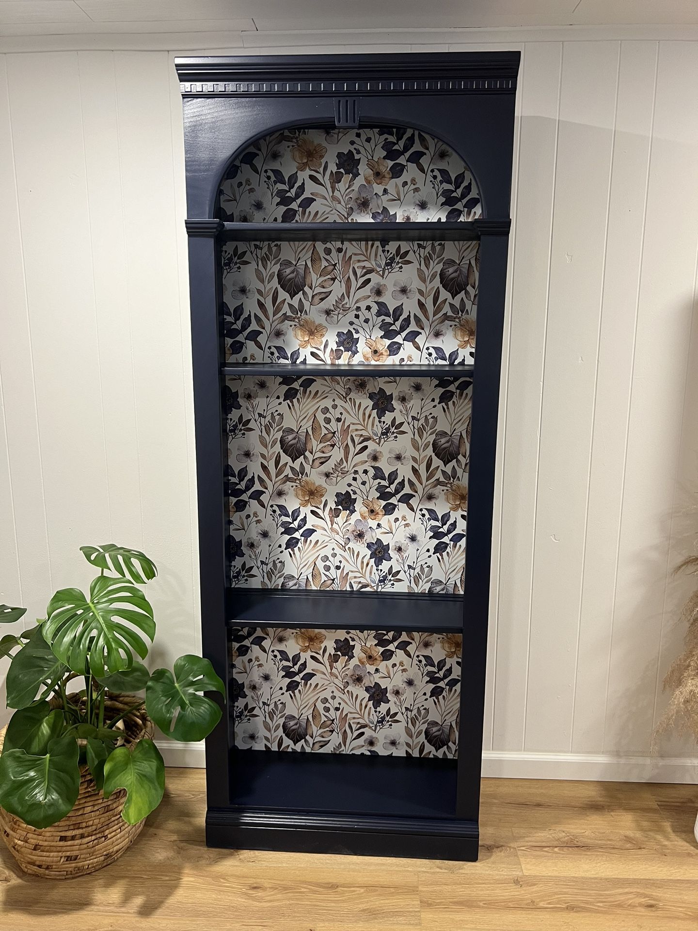 Navy blue bookshelf with a floral design. Classic and modern look that adds elegance and charm to any room. • Dimensions: 80”H x 10.5”D x 30”L Includes an additional shelf Delivery available depending on your location (extra fee applies). Message me if you’re interested or would like more info!