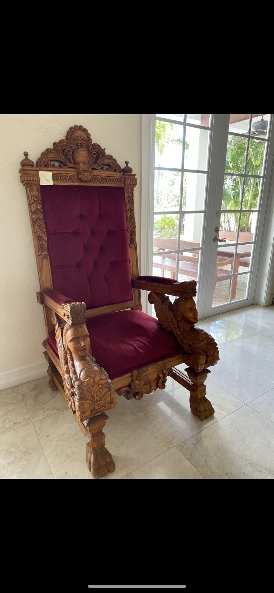 2 large, hand-carved mahogany throne chairs with a high back and red velvet upholstery