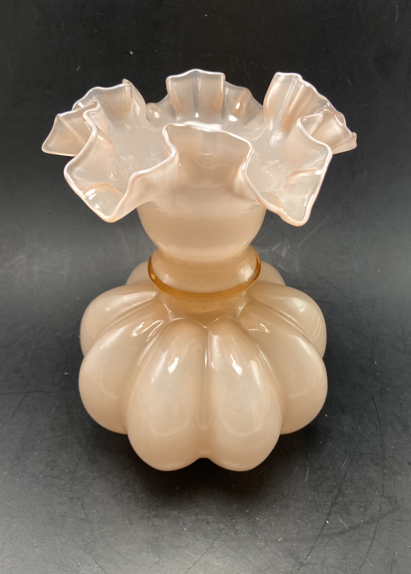 Vintage FENTON 1940s ~ 8" PINK MELON glass peach ruffle double crimped vase