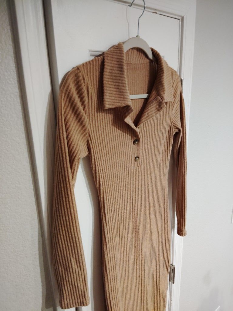 Tan button up winter dress with leg slit Mimicking faux cordoroy material Bought from SHEIN, Never worn Fits like a Small Discounts π bundle 5+ clothing items π