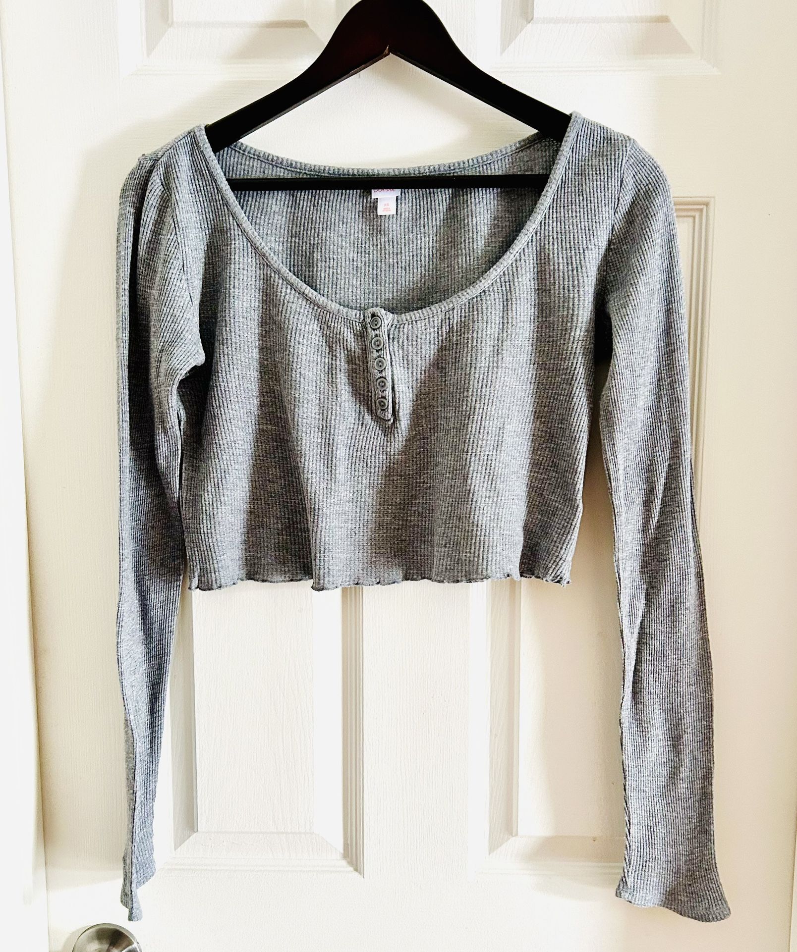 Stylish ribbed crop top by Colsie. Features long sleeves and buttoned neckline. Perfect for casual wear. Size: XS In very good condition.