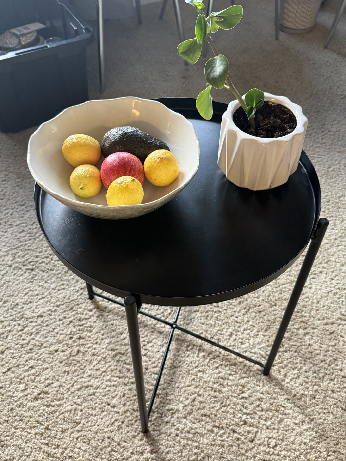 IKEA side table. Round. 18” round I put a round wood turntable on top and the black metal shelf on bottom when I used it. Moving long distance and selling everything. Check out my other listings. Located in DTC.