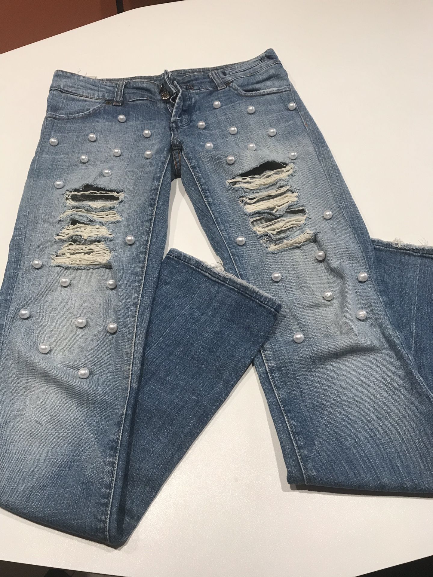 Women's Stretchy Pearls Embellished Mid Rise Jeans, 26