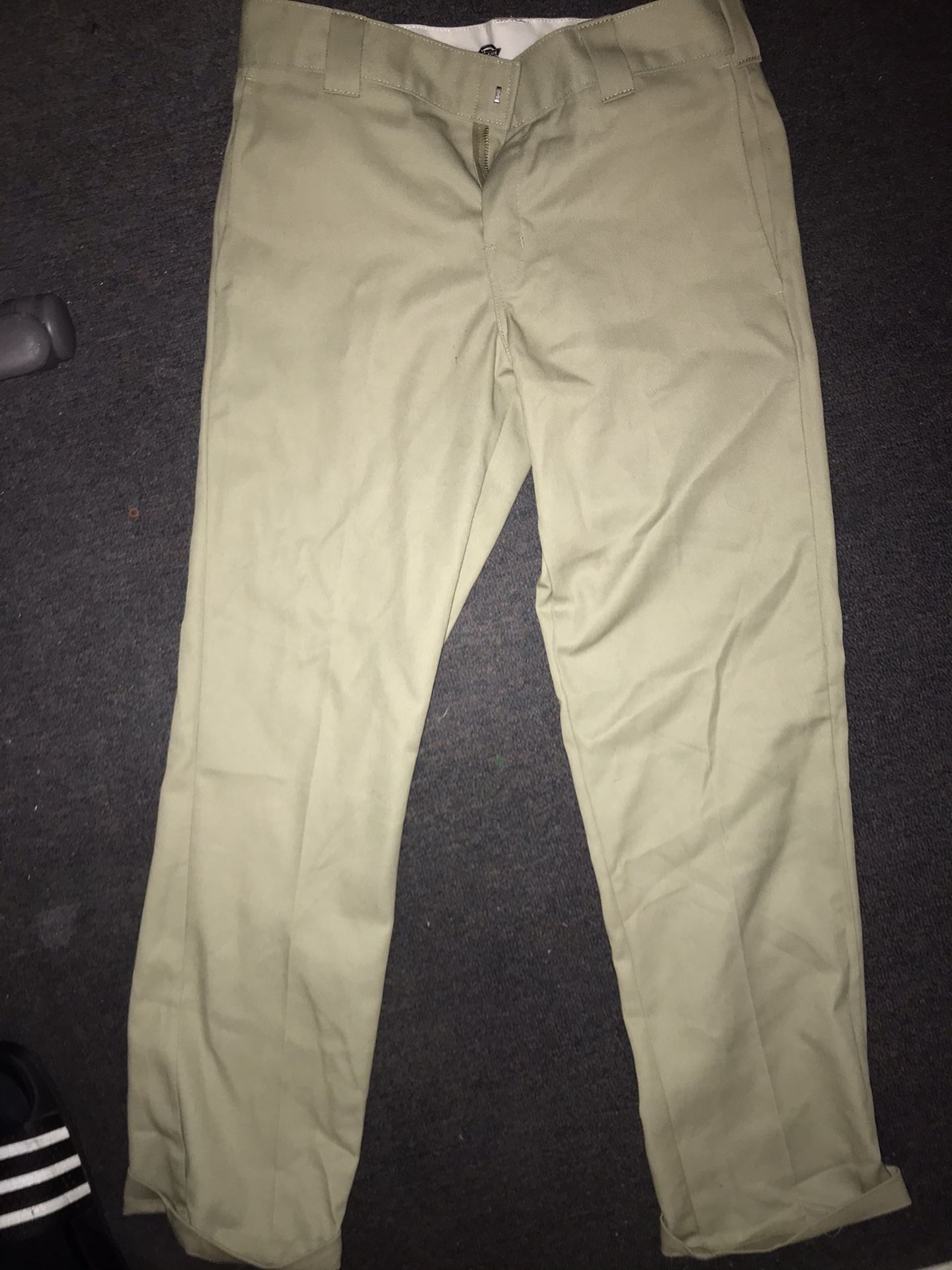 Beige color Never worn too small for me Slim straight Perfect for work and style Size 32/32