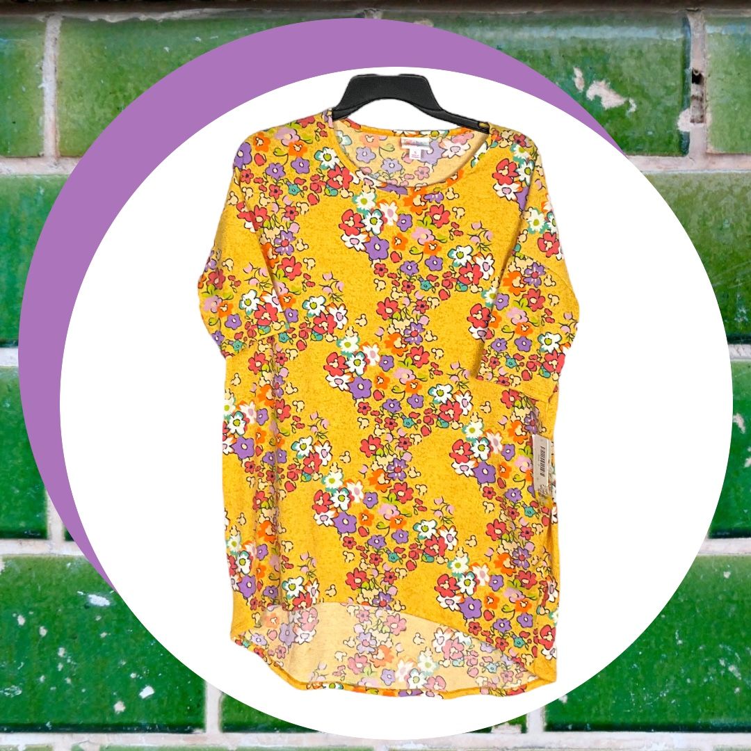 NWT Disney Mickey LulaRoe Irma Long Top S Gold With Multicolored Flowers Measures 25” Across from Pit to Pit Front Length 29”; Back 33” 95% Polyester, 5% Spandex