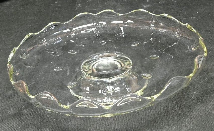 This is a vintage clear pressed glass Pedestal cake plate featuring a a smooth, shallow bowl-like plate with a gracefully scalloped rim, elevated on a flared Pedestal stem.