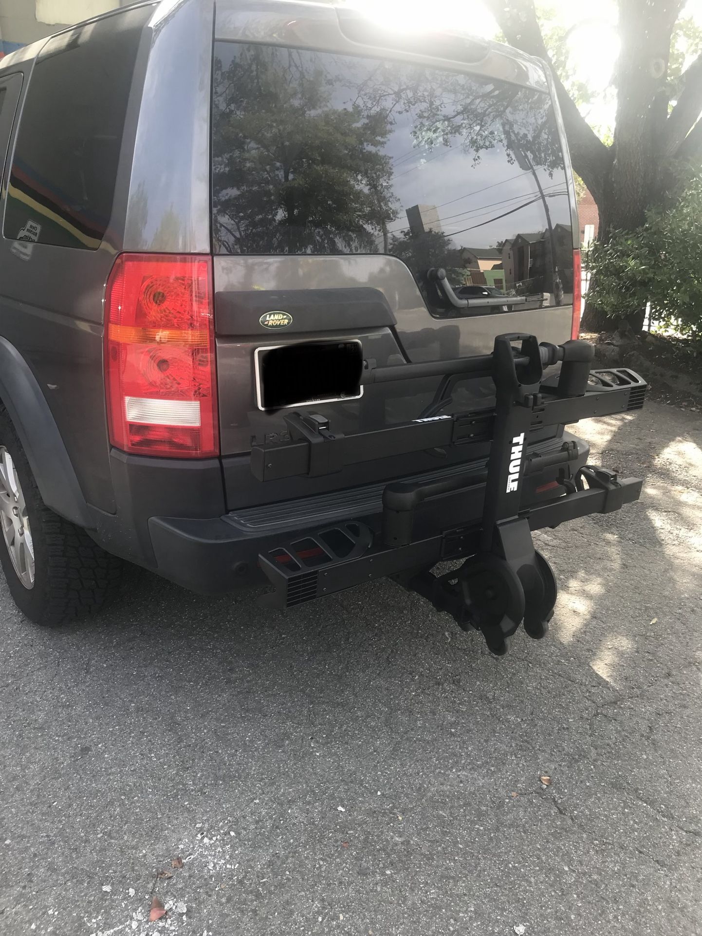 Great condition Thule hitch-mounted platform bike rack that holds 2 bikes and fits a 2-inch trailer hitch receiver. About 4 years old and lightly used. Best feature: it has built-in rollers/wheels, so you can roll it around like a roller bag for easy moving and storage instead of carrying the full weight. Folds up when not in use. Includes everything shown in the photos. Local pickup. Cash or Venmo.